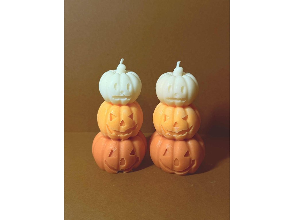 Roztomilá svíčka složená ze tří dýní v odstínech oranžové a krémové - symbol veselého Halloweenu