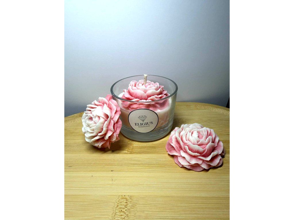 Elegantní svíčka s květinovou dekorací ve tvaru pivoňky, která provoní váš domov jemnou a romantickou květinovou vůní.